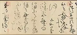 Huang Tingjian (simplified Chinese: 黄庭坚; traditional Chinese: 黃庭堅; Wade–Giles: Huang T'ing-chien; 1045, Jiangxi province, China–1105, Yizhou [now Yishan], Guangxi)[1] was a Chinese calligrapher, painter, and poet of the Song dynasty. He is predominantly known as a calligrapher, and is also admired for his painting and poetry. He was one of the Four Masters of the Song Dynasty (Chinese: 宋四家), and was a younger friend of Su Shi and influenced by his and his friends' practice of literati painting (simplified Chinese: 文人画; traditional Chinese: 文人畫), calligraphy, and poetry; regarded as the founder of the Jiangxi school of poetry.[1]