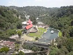 The other well-known hacienda of the area is San Miguel Regla, which is located just outside the town of Huasca, in a community also called San Miguel Regla. This hacienda was constructed by Romero in the 18th century and is also dedicated to mining.[4][12] The hacienda conserves many of its structures such as the five-meter stone perimeter wall, arches of the main patios, the main house, the smelting ovens (now flooded), holding tanks for ore and the gardens.[5] Much of the former property of San Miguel Regla is now ejido land,[4] but the complex has been converted into a hotel and ecotourism park. The main house is a luxury hotel, with small villas constructed over the property connected by footpaths. The gardens of the area are maintained as they were in the 18th century, with a modern heated swimming pool added. Other offerings include a clay tennis court, bar, game room, videorental and a meeting hall that accommodates 160 people. The lake by this hacienda has walking paths, fountains and a Greek-style theatre.[2][12]