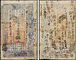 The precursor of paper money (紙幣) known as "flying cash" were issued by the Tang dynasty; however, these bills of exchange could in no way be considered to be a form of paper money as they were not meant to be a medium of exchange and were only negotiable between two distant points.[13] The first true paper money in the world was issued under the Song dynasty, these were promissory notes issued by merchants in Sichuan known as the Jiaozi,[14] under the reign of Emperor Zhenzong (997–1022) the government of the Song dynasty granted a monopoly for the production of Jiaozi notes to sixteen wealthy merchants in Sichuan, as these merchants were slow to redeem their notes and inflation started affecting these private notes the government nationalised paper money in the year 1023 under the Bureau of Exchange. As these paper notes were backed by the government they were instantly successful and the people regarded them to be equally trustworthy as cash coins, other types of paper notes issued under the Song dynasty include the Huizi and the Guanzi.[15] Before the Mongol Empire conquered China the Jin dynasty also issued paper money.[16][17]