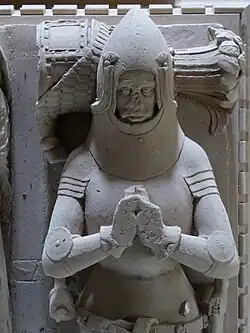 - Edward Courtenay,[14] only son and heir apparent who predeceased his father aged 16, believed to be represented by the very fine miniature alabaster effigy in Haccombe Church, next to the large monument to his parents. Two angels support his pillow and a dog is at his feet. Had he lived he would have been not only lord of the manor of Haccombe, but also Earl of Devon,[15] and would have prevented the Carews from inheriting Haccombe.