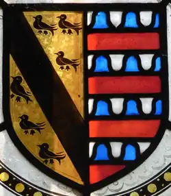 In 1384, Sir Hugh Luttrell married Catherine Beaumont (d. 28 August 1435),[4] a daughter of Sir John Beaumont (d.1379/80)[5] of Shirwell and Saunton in North Devon, MP for Devon 1376–80,[6] a substantial landowner in Devon, by his second wife Joan Crawthorne, granddaughter and heiress of Sir Robert Stockey, MP in 1318, of Crawthorne and Cranstone.[7] Alabaster effigies survive in Dunster Church of himself and his wife, badly mutilated.[8] The arms of Beaumont (Barry of six vair and gules) appear in Dunster Church and on the Luttrell Table Carpet, c.1520, now in the collection of the Burrell Collection in Glasgow, probably made in about 1520 to record the marriage of his descendant Sir Andrew Luttrell (1484–1538) of Dunster and his wife Margaret Wyndham (d.1580). By his wife he had six children:
