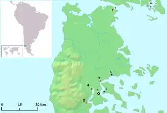 Huilliches of Chiloé had previously taken action against their Spanish lords back in 1600, when a group helped the Dutch corsair Baltazar de Cordes attack the Spanish settlement of Castro.[1][2] Unlike that of continental Chile, the Indigenous population of Chiloé grew from 1700 onwards.[2] By 1712 Indigenous peoples made up around 50% of the population of the archipelago.[2] The encomiendas of Chiloé were the largest of Chile and their administration of this form of forced labor more abusive than on the mainland.[2] Moreover, the encomenderos did not fulfill their obligations, registering neither tribute nor salaries.[2] Encomenderos often did not pay legal salaries or salaries at all and did not observe the "free time" of Indians defined in the encomienda laws.[2] The encomienda activities in Chiloé included the Indians traveling to the continental coast to log for alerce wood.[3]