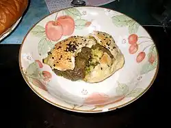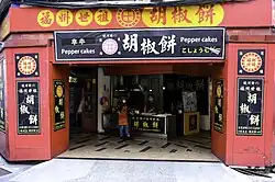 Hujiao bing or pepper bun (Chinese: 胡椒餅; pinyin: hújiāo bǐng; Pe̍h-ōe-jī: hô͘-chio-piáⁿ; lit. 'black pepper cake or biscuit') is a type of baked bun that originated in city of Fuzhou, the capital of China's Fujian province. It is a street food that has become popular in Taiwan and can be found in night markets or mini food stalls throughout Taiwan. The common ingredients are flour, water, and a leavening agent for the outer dough shell, and a meat protein (usually pork or beef) marinated with sugar, soy sauce, white pepper or black pepper, and scallion for the inside filling.[1]