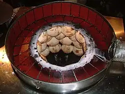 The buns are then baked in a cylindrical, high-heat, clay oven that is similar to a tandoori oven. Burning charcoal is put at the bottom to heat the oven. The buns are then stacked vertically along the side of the oven, from bottom to top. To remove the finished buns, a flat object such as a blunt knife or spatula is used to scrape the bun off of the side of the oven. A colander is then used to catch the buns to prevent them from falling into the charcoal pit at the bottom of the oven.[2]