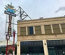 In 2010, Security Signs restored the sign, which now hangs at the intersection of Northwest Fourth Avenue and Couch Street.[5] The restoration cost $77,000 (equivalent to $111,000 in 2024), $45,000 of which was paid for by the Portland Development Commission.[5][10] An additional $8,600 was raised from T-shirt sales and other fundraisers,[10][15] and the Old Town Chinatown Business Association and neighborhood businesses also supported renovation efforts.[1] The neon sign's pagoda top and bottom half were salvaged, and the rest of the structure was crafted from aluminum. The pieces were welded together, sanded, then covered with a zinc-based primer and multiple layers of acrylic polyurethane paint. The sign's treatment has an estimated lifespan of 50 years.[5]