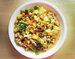 A thinner, vegetable stew (almost like a soup, but thicker), similar to pottage. It can be made with a variety of vegetable bases, such as cabbage, potatoes, kidney beans, squash, spinach, lentils, tomatoes, sorrel, peas, dill, or some combination. Meatballs (fasírozott), spicy sausage (kolbász), or a fried egg (tükörtojás) may be added. It usually eaten at home as a home-cooked meal.