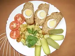 Stefánia szelet | Hungarian meatloaf with hard boiled eggs in the middle. Makes decorative white and yellow rings in the middle of the slices, and is often served with potatoes. | |