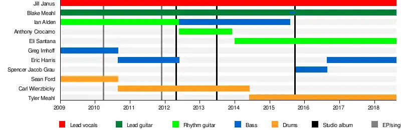 In October 2015, Janus posted a now-deleted note on Facebook announcing the band was coming to an end, and that she would continue to make music on her own. Lead guitarist Blake Meahl, however, dismissed her statement as a consequence of her health and mental issues, and said the band would continue to perform.[3][4] On August 14, 2018, Jill Janus died by suicide.[5][6][7]