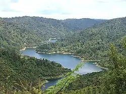 From the 1920s onwards the land was progressively bought by Auckland City Council utilising funds from its water supply operation.[12] Development of the water supplies commenced in 1946, with the first of the four dams, Cossey's, completed with a capacity of 11.3 million cubic meters in 1956.[13] Three embankment dams were constructed in the area: Upper Mangatāwhiri (1965), Wairoa (1975) and Mangatangi (1977).[13] Combined, the dams have a capacity of 77.1 million cubic meters, and supply approximately 68% of Auckland's potable water, through the Ardmore Water Treatment Plant.[14]