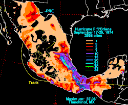 As Fifi tracked over Central America, the outer fringes of the storm produced 4 in (100 mm) of rainfall as far north as Campeche. Mexico sustained little or no damage from Hurricane Fifi.[4] Once re-designated as Hurricane Orlene, however, the storm impacted the Pacific coast of Mexico as a Category 2 hurricane.[11] There were no reports of casualties or major damage.[8] In Acapulco, reports indicated that 11 in (280 mm) of rain fell within a six-hour span.[1] Remnant moisture from the hurricane brought minor rainfall to portions of Arizona.[38]