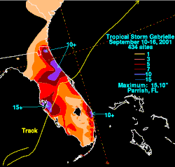 - ^ a b Mike Branom (2001-09-15). "Tropical Storm Gabrielle sloshes across Florida; thousands lose power". Sarasota Herald-Journal. Associated Press. Retrieved 2012-04-16.