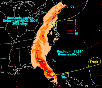 ![]() Hurricane Jeanne making landfall in Florida at peak intensity on September 26 | |