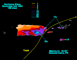 While moving past Puerto Rico, Tropical Storm Klaus dropped heavy rainfall peaking at 25.69 inches (653 mm) in Guavate Camp in the southeastern part of the island. Much of the southern half of Puerto Rico reported over 7 inches (180 mm) (178 mm). Vieques received around 7 inches of precipitation, while Culebra experienced over 10 inches (250 mm).[5] The heavy rainfall resulted in freshwater flooding.[4] The strongest winds of the storm remained offshore, and wind gusts peaked at 37 miles per hour (60 km/h) in Roosevelt Roads Naval Station. Winds and rainfall on the island resulted in downed trees and power lines, though damage was minimal. Klaus struck the island on election day, causing slight disruptions to the process.[6]