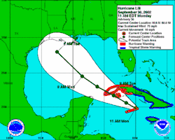 Hurricane Lili was the second costliest, second deadliest, and most intense hurricane of the 2002 Atlantic hurricane season, only surpassed by Hurricane Isidore, which affected the same areas around a week before Lili. Lili was the twelfth named storm, fourth hurricane, and second major hurricane of the 2002 Atlantic hurricane season. The storm developed from a tropical disturbance in the open Atlantic on September 21. It continued westward, affecting the Lesser Antilles as a tropical storm, then entered the Caribbean. As it moved west, the storm dissipated while being affected by wind shear south of Cuba, and regenerated when the vertical wind shear weakened. It turned to the northwest and strengthened up to category 2 strength on October 1. Lili made two landfalls in western Cuba later that day, and then entered the Gulf of Mexico. The hurricane rapidly strengthened on October 2, reaching Category 4 strength that afternoon. It weakened rapidly thereafter, and hit Louisiana as a Category 1 hurricane on October 3. It moved inland and dissipated on October 6.[1]