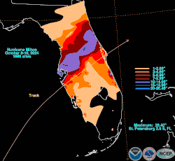 Heavy rain also occurred in the state, with over 13 in (330 mm) of rain in Plant City and nearly 19 in (480 mm) in St. Petersburg, including 5.09 in (129 mm) in a single hour.[149][150][151] In Tampa, nearly 12 in (300 mm) of rain fell, which pushed the city to its wettest year on record.[152] Further east, rainfall totals exceeded 12 in (300 mm) in portions of Volusia County, and 10 in (250 mm) in Indian River County, with 12.92 in (328 mm) of rain in Vero Beach.[153][154] Rainfall totals in Flagler County were lower, but 5.61 in (142 mm) of rain was still recorded in Flagler Beach.[155] A storm surge of 5 ft (1.52 m) to 10 ft (3.04 m) was recorded from Naples to Siesta Key, including Charlotte Harbor.[9] Water levels rose over 8 ft (2.4 m) near Sarasota.[9] Naples saw a storm surge of 5.75 ft (1.75 m).[9] On the other side of the state, Daytona experienced a storm surge peak between 4 ft (1.2 m) to 4.5 ft (1.37 m).[156] The Hillsborough River crested at nearly 2 ft (.61 m) over record height Friday at Zephyrhills. At the river's Morris Bridge site, it crested over 3 ft (.94 m) above record flood stage.[157] A reverse storm surge occurred in Tampa, however, dropping water levels by 5 ft (1.5 m).[158]