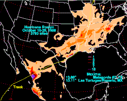 As water temperatures remained very warm along its path, the hurricane was able to intensify quickly. Roslyn reached peak winds of 145 mph (230 km/h) 48 hours after attaining hurricane status, while located about 550 miles (890 km) southwest of Manzanillo, Colima; that made it the strongest hurricane of the season. Roslyn maintained peak intensity for about 18 hours, during which it turned more to the northwest in response to a powerful advancing cold front. On October 20, the hurricane curved northeastward as steady weakening ensued. After bypassing southeast of the Baja California Peninsula, Hurricane Roslyn moved ashore on October 22 at Mazatlán, Sinaloa with winds of 75 mph (120 km/h).[1] The low-level center rapidly dissipated, although the upper-level circulation continued northeastward along the advancing cold front. A frontal low developed in the western Gulf of Mexico, which moved over southeastern Texas and later through the Mississippi Valley. The original upper-level circulation maintained its northeast movement, bringing rainfall to the southeastern United States.[2]