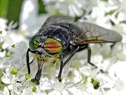 Males of these horse flies feed on plant juices, while female are bloodsuckers,[7] feeding mainly on mammalian blood, as they require a blood meal before they are able to reproduce. They may be very annoying for cattle, but usually they do not bite people.[7]