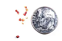 Seeds of Trifolium pratense (red clover) next to a U.S. dime for scale.