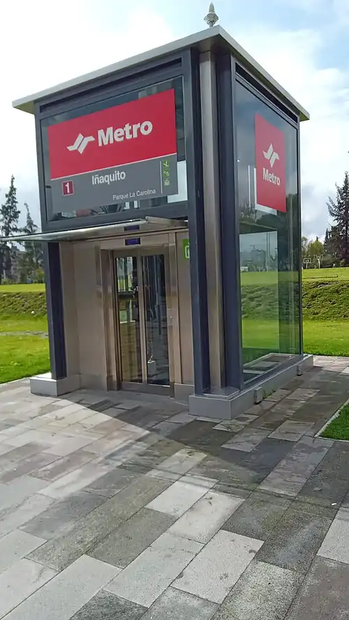 Iñaquito is a Quito Metro station. It was officially opened on 21 December 2022 as part of the inaugural section of the system between Quitumbe and El Labrador. The revenue service started on 2 May 2023 and stopped on 11 May 2023.[1] It resumed on 1 December 2023.[2] The station is located between Jipijapa and La Carolina.[1]