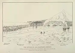 No landing took place on the islands until March 1855, when American sealers from Corinthian, led by Erasmus Darwin Rogers, went ashore at a place called Oil Barrel Point. From 1855 to 1882 a number of other American sealers spent a year or more on the island, living in appalling conditions in dark smelly huts, also at Oil Barrel Point.[19] The island was also exploited by Australian sealers, including James William Robinson's 1858 expedition on behalf of Tasmanian merchant William Crowther. Robinson's memoir of the expedition was deposited in the W. L. Crowther Library and provides one of the most detailed accounts of early conditions on the island.[20] At its peak the community consisted of 200 people. By 1877, sealers had wiped out most of the seal population and left the island. In all, the islands furnished more than 16 thousand cubic metres (4.3 million US gallons) of elephant seal oil during this period.[19]