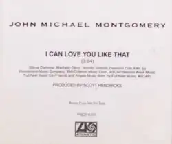 "I Can Love You Like That" is a song written by Steve Diamond, Jennifer Kimball and Maribeth Derry, and recorded by American country music singer John Michael Montgomery. It was released in February 1995 by Atlantic Records as the first single from his self-titled CD (1995). The song reached the top of the US Billboard Hot Country Singles & Tracks (now Hot Country Songs) chart.
