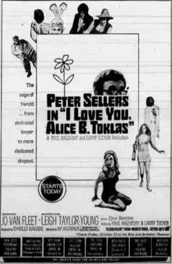 I Love You, Alice B. Toklas is a 1968 American romantic comedy film directed by Hy Averback and starring Peter Sellers.[2] The film is set in the counterculture of the 1960s. The cast includes Joyce Van Patten, David Arkin, Jo Van Fleet, Leigh Taylor-Young (in her film debut) and a cameo by the script's co-writer Paul Mazursky. The title refers to writer Alice B. Toklas, whose 1954 autobiographical cookbook had a recipe for "Haschich Fudge".[3] The film's eponymous theme song was performed by sunshine pop group Harpers Bizarre.[4]