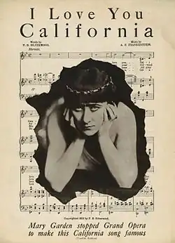 The lyrics were written by Francis Beatty Silverwood (1863–1924), a Los Angeles clothier,[1][2] and the words were subsequently put to music by Abraham Franklin Frankenstein (1873–1934),[3] then conductor of the Orpheum Theatre Orchestra,[4] with an inaugural performance by Mary Garden. Frankenstein was a cousin of the San Francisco Chronicle's long-time music and art critic Alfred V. Frankenstein.[5] The song was published by Hatch & Loveland, Music Printers, Los Angeles, California,[6] and copyrighted by F.B. Silverwood in 1913. It was the official song of expositions held in San Francisco and San Diego in 1915.