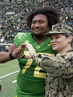 ![]() Iapani Laloulu takes a photo with an Oregon NG member at Autzen Stadium in 2024. | |