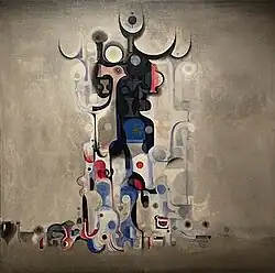 El-Salahi is considered a pioneer in Sudanese modern art and was a member of the "Khartoum School of Modern Art", founded by Osman Waqialla, Ahmad Mohammed Shibrain, Tag el-Sir Ahmed and Salahi himself.[1][16] Other members of this artistic movement in Sudan were poets, novelists, and literary critics of the "Desert School", that also sought to establish a new Sudanese cultural identity.[8] One of the main areas of focus for the Khartoum School was to create a modern Sudanese aesthetic style and not relying only on Western influences.[8] In the 1960s, he was briefly associated with the Mbari Club in Ibadan, Nigeria.[6][7] In an interview with Sarah Dwider, a curator at the Guggenheim Abu Dhabi, El-Salahi commented about his time spent in Nigeria and the impact it had on his work: "My short visit to Nigeria in the early 1960s gave me the chance to connect artistically with a dynamic part of the African continent, opening myself to influence and be influenced."[17]