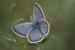 The Puget blue is a small blue and grey butterfly with a wingspan of around 1.8 inches (4.6 cm) in the family Lycaenidae. The male has dorsal wings that are a silvery blue with a wide dark margin. The female is grey brown with diffuse blue patches at the base of the wings, with chocolate brown inner wings.[3] The range of this subspecies spans from Vancouver Island and the Olympic Mountains in alpine to subalpine habitat to the lowland prairies of the South Puget Sound.