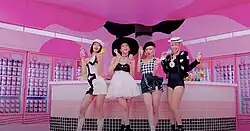 The music video shows Gomez and Blackpink in a number of colorful[21] sets and outfits. It opens with Gomez in a candy-striped bikini with gold hoop earrings and a white sailor hat, driving a pastel-colored ice cream truck filled with Serendipity Ice Cream. The ice cream truck has the word "Selpink" written on it, a combination of "Selena" and "Blackpink".[33] The members of Blackpink appear next on-screen, popping up smiling behind ice-cream shaped cardboard cutouts. During her first verse, Jennie appears in a blue Care Bears-printed dress, wearing matching blue eyeliner;[34] later in the video, she is joined by a capybara.[35] Blackpink are then shown riding bikes and dancing in a colorful, Candy Land-like[16] cul-de-sac,[14] while Gomez stands outside of the ice cream truck wearing a Puma romper with a green visor. Gomez appears in a polka-dot yellow top with blue culottes for her next verse,[36] standing in front of a wall which reads "Ice Queen" in graffiti.[35] Rosé then appears alongside a golden retriever.[37] Next, Jisoo walks out of a cherry-patterned car parked in a cherry-patterned garage, holding a cherry and wearing cherry-themed accessories with a diadem.[34] For the second chorus, Blackpink dance in a pastel pink tennis court,[38] holding tennis rackets and wearing white tennis skirts and crop tops,[39][35] while Selena is shown sitting in a Chevrolet,[36] sporting a 1950s pin-up-inspired updo and wearing a yellow plaid off-the-shoulder romper.[33][40] Blackpink appear in a bright pink ice cream parlor for the second post-chorus, holding ice cream and wearing black-and-white outfits.[41] Blackpink are shown dancing and holding cat ice cream pillows during Lisa's rap verse.[34] As the song closes, Blackpink drive around in metallic pink Mercedes-Benz Power Wheels cars and, in a separate scene, play on a blow-up slide, wearing crochet outfits.[42]