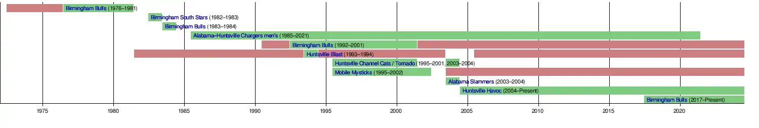 During the heyday of the UAH Chargers, several attempts at establishing minor league hockey were made. In 1992, a team relocated to Birmingham and became the second Bulls franchise. Art Clarkson, the owner of the Birmingham Barons, brought the team from Cincinnati and the next year had a local rival when the Huntsville Blast arrived from Virginia. The two teams played one another in the first round of the ECHL playoffs that year but their rivalry was short-lived. Huntsville moved out of state after the year, leaving Birmingham as the only professional team in the state.[6] A year later, however, that situation was remedied when the Mobile Mysticks were founded. The Mysticks had some success but began to see falling attendance almost immediately. The team stated with an average of more than 5,300 in their first season but average attendance fell every year afterwards save one. Going 0–7 in their first three playoff series didn't help matter and by the time the 21st century rolled around Mobile was getting less than 3,500 per game. The bottom fell out in 2002 with an average of about 2,600 and, with the team failing to make the postseason, the franchise suspended operations after the year.