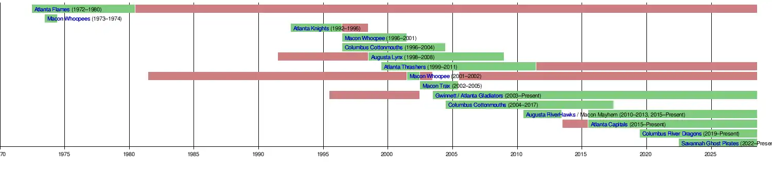 In the wake of the Thrashers' departure, Atlanta was not bereft of professional ice hockey as the Gwinnett Gladiators had been playing in the region since 2003. The survival of the Gladiators, since rebranded 'Atlanta' has helped to spur on a second wave of minor league hockey in the state as each of the previous outposts saw further attempts at establishing a franchise. While the Augusta RiverHawks only lasted three seasons, their relocation met with more success and the Macon Mayhem were able to win the SPHL championship in 2017. The Columbus River Dragons were founded in 2019 and managed to navigate their way through the choppy waters of the COVID-19 pandemic to win a league championship in 2021. With the second wave of minor league teams appearing to be more successful, Savannah became the newest hockey city in the state when the Savannah Ghost Pirates were founded in 2022.