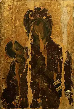The first Christian icons in the territory of modern Ukraine were of Greek origin: according to chronicles, Church of the Tithes in Kyiv was decorated with icons brought by prince Volodymyr from Chersonesus. The oldest preserved icons stemming from the Rus' era come from the 11-12th centuries and include such notable works as the Virgin of Vladimir (now stored in Tretyakov Gallery in Moscow), Igor's Icon of the Mother of God (now in Kyiv Pechersk Lavra), Pechersk Mother of God, Icon of Saints Boris and Gleb, Mezhyhirya Icon of the Saviour, Virgin of Smolensk, Kholm Icon of the Mother of God etc.[1]