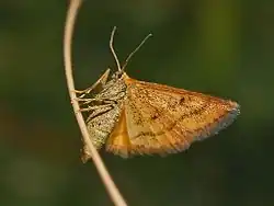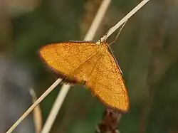 Idaea flaveolaria has a wingspan of 12–14 millimetres (0.47–0.55 in) in females and 14–18 millimetres (0.55–0.71 in) in males. The basic color of the wings is bright brown orange. On the forewings and hindwings there are two brown transversal lines, often almost indistinct. These transversal lines appear more clearly on the underside of the wings, together with a dark discal spots. The edge of the wings shows a blackish fringe.[3]