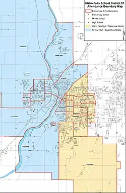 The Idaho Falls School District #91 is a public school district in the U.S. state of Idaho. District #91 serves about 10,742 students of Idaho Falls, Idaho, and parts of rural Bonneville County in 18 schools, making it the seventh-largest by enrollment in the state. The district has: 12 elementary schools serving students in K-6, two middle schools serving students in grades 7-8, and two high schools serving students in grades 9-12, along with an alternative high school and Compass Academy, a magnet high school through the New Tech Network.[3]