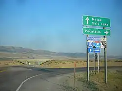 Every year, the ITD conducts a series of surveys on its highways in the state to measure traffic volume. This is expressed in terms of average annual daily traffic (AADT), which is a measure of traffic volume for any average day of the year. In 2018, ITD calculated that 1,400 vehicles traveled the on highway. The highest traffic section is the first approximately 1,000 feet (300 m) east of I-15, which would include traffic between I-15 and the Flags West Truck Stop. The lowest traffic section was the eastern end (from the intersection with South Race Track Road/South Olson Road to the US-91), which had an AADT of only 550 vehicles.[3] The posted speed limit for the entire length of the highway is 65 miles per hour (105 km/h).