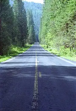 Between Harvard and Emida, the route crests at an elevation of about 3,600 feet (1,095 m) above sea level. This is a park 'n' ski lot (Palouse Divide) for cross-country skiing,[3] and the turnoff to North–South Ski Bowl, a defunct alpine area which is now a private conference and retreat lodge.[4][5]