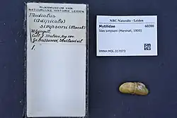 In 1900, some fishermen trawling the seabed between the Hebrides and the Shetland Islands brought to the surface part of a whale skull to which was attached about twenty bivalve molluscs. They passed their find to James Jenkins Simpson, a shell collector in Aberdeen, and he sent them on to the conchologist James Thomas Marshall.[2] Marshall determined that the molluscs were new to science, and formally described them, naming the new species Myrina simpsoni.[1] Apart from one specimen which was found inside a baulk of drifting pinewood, all specimens seen since then have been associated with the skeletons of dead whales, making this mollusc the first known species with such a restrictive habitat requirement.[2] The species has since been transferred to the genus Idas, making it Idas simpsoni.[1]