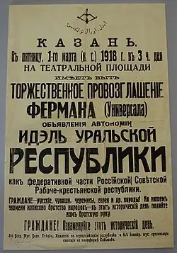 The Idel-Ural State (Tatar: Идел-Урал өлкәсе, İdel-Ural ölkäse, ادیل-اورال اولكسی, also İdel-Ural berlege İdel-Ural ştatı), also known as the Volga-Ural State or Idel-Ural Republic,[3] was a short-lasting autonomy of Tatar peoples that claimed to unite Tatars, Bashkirs, and the Chuvash in the turmoil of the Russian Civil War. The republic was proclaimed on 1 March 1918, by a Congress of Muslims from Russia's interior and Siberia, but defeated by Bolsheviks the same month.[4] Idel-Ural means "Volga-Ural" in the Tatar language.