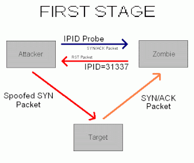 1. Attacker to target -> SYN, target to zombie ->SYN/ACK, Zombie to target -> RST (IPID increment by 1)