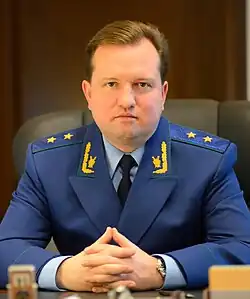 In 2001, he became an assistant prosecutor in the Nakhimovsky district of the city of Sevastopol in Crimea.[1] Then, in 2003, he joined the Prosecutor's Office in the city of Sevastopol.[1] On March 25, 2014, he became the acting public prosecutor of the city of Sevastopol by order of Yury Chaika, the Prosecutor General of Russia, and since May 2, 2014, he has been appointed by Vladimir Putin as the Prosecutor of the City of Sevastopol.[1]