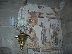 At the left of the altar, through a triumphal arch, is fresco painting consisting of monk and angel, in partial ruin, with fragments missing. The interior paintings, executed in fresco over a thin layer of plaster, was completed in a restricted colour palette: ocres, reds, black, blue and a mixture of the two.[2] Incisions were detected in the plaster, corresponding to the original design that was applied to the wall, although there are no indications of junctions between the plaster.[2]