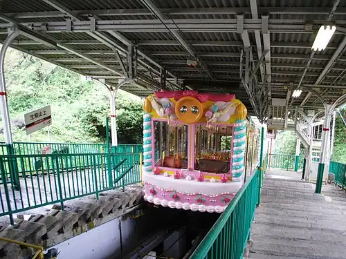 Passengers can get on and off a cable car only to and from the right side of the direction for Hozanji in regular operations. The opposite platform is usually closed.