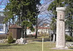 The Ilmenau station forecourt was redesigned in 2000. The area has been laid out for traffic, along with a 50-metre-wide and 200 metre-long park. There are some old trees, hedges, meadows and flowerbeds. As "a welcome sign" all travellers who leave the station are greeted by miniature replicas of a Kickelhahn tower and the Goethehäuschen (Goethe's cabin). There is a taxi stand directly in front of the station. To the right there is the bus station, which was redesigned at the end of 1999.