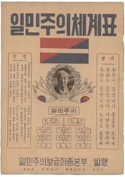 The Association for the Propagation of Ilminism (일민주의보급회; 一民主義普及會) was a nationalist organization founded in September 1949. The organization aimed at promoting popularism centered on Syngman Rhee, led by former members of the Korean National Youth Association led by Lee Bum-seok and Ahn Ho-sang. It criticized both capitalism and communism, but had a pro-American tendency. Due to the intensifying Cold War, anti-capitalism sentiment did not increase during this time period.[20][21]