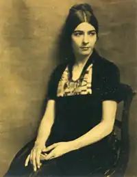 Karasz was born in the Hungarian capital, Budapest, the oldest of three children of Mary Huber Karasz and silversmith Samuel Karasz.[2] One of her younger sisters was the fashion designer and textile artist Mariska Karasz. She studied art at the Royal Academy of Arts and Crafts during a period when the reigning aesthetic owed much to the Wiener Werkstätte and was one of the first women to be admitted to the school.[3] At the age of 17, she immigrated to the United States in 1913, and began to make a career for herself in New York City‘s Greenwich Village, where she established herself as an influential practitioner of modern art and design.[4] In 1914, Karasz co-founded (with Winold Reiss) the European-American artists' collective Society of Modern Art, and shortly afterwards she was commissioned to create advertising for the department store Bonwit Teller. For a few years in the late teens she taught textile design at the Modern Art School.