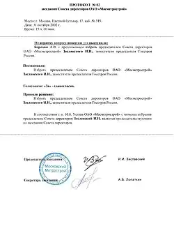 - ^ "Certificate of appointment for Ilya Zaslavskiy as chairman of the managing board (Совет директоров) of Mosmetrostroy" (in Russian). October 31, 2002.