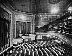 On either side of the proscenium is a wall section with three boxes on the balcony level, which step down toward the stage.[25] The theater was originally designed with boxes on orchestra level as well,[18] though these have been removed.[27] The fronts of the boxes are curved outward and contain molded decorations at the top and bottom.[20] The boxes on each side are set into rectangular openings, which contain a pair of octagonal columns that divide the boxes. Each opening is surrounded by a band of foliate and geometric designs in plasterwork. Above the openings are rectangular plasterwork panels. Within these panels are depictions of winged fairy-like figures, holding theatrical masks that represent comedy and tragedy.[25]