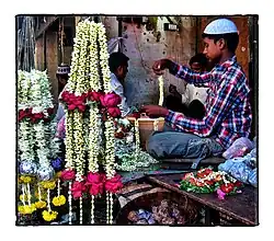 Folklore is one of the central subjects in the poetry of Naidu. In The Bazaars of Hyderabad is associated with one such subject, the charm and enthusiasm of a traditional bazaar in the city of Hyderabad is introduced in this poem. Naidu had described the Bazaar with merchants and vendors selling a diverse range of merchandise. The poet stops over at the galleries arranged by the merchants, traders, hawkers, goldsmiths, fruit sellers, peddlers, magicians, musicians, and flower girls. The poet describes the formal experience of conversation between the seller and the buyer, here the poet questions the vendors about there merchandise and who in turn politely enunciate their goods. Emotional moods are stirred by the poet when Naidu makes the readers feel that the bazaar life also witnesses both sorrows and joys. Wedding and festival occasions bring joy in the Bazaar's life when people buy jewelry, garlands, fruits, and children crowd near the magicians. The sorrow and sadness are witnessed when common public kitchens are arranged when the nobles or soldiers die and when flower girls are seen weaving masses of white flowers to adorn the graves of the dead people, to which Naidu said, "perfume the sleep of the dead".[1][12][13][14][15]